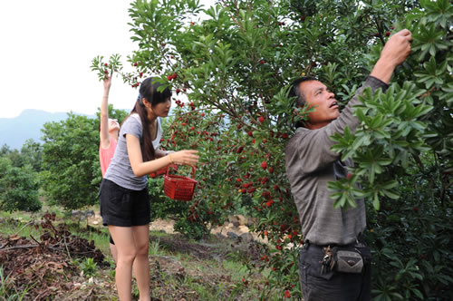 图为龙斗的果农老陈在自家的杨梅山上,和城里来的市民一起采摘刚刚成熟的杨梅。