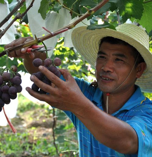 3日,清流县嵩溪镇的台湾黑后提子种植园内,工人正在采摘果实。据悉,去年清流引进台湾黑后提子进行大棚种植,成熟期比以往品种提前1个月左右,价格也翻了3番,预计每亩产值可达4万元以上。