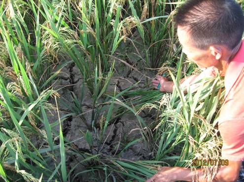李中华是邵阳县谷州镇中庙村农民,看到国家惠农政策越来越好,今年返城回乡,以450元一亩的租金从乡亲们手里承包了120亩水田,前期投入生产资金20多万元,110亩早稻眼看丰收在望,但6月底开始的旱情,让他费尽脑筋,为了抗旱,前几天他特意购买了四台抽水机,2000米水管和相配套物资,花去8000多元,7月6日开始请人帮忙抽水,三天三夜没停,但收效甚微,尚有近70亩早稻田等待灌溉。更让人担心的是,澶江水满,李中华的田近在咫尺,却因渠系不配套,“如果镇里和村里不马上组织人员修通渠道,我就会面临无水可抽的窘境”。