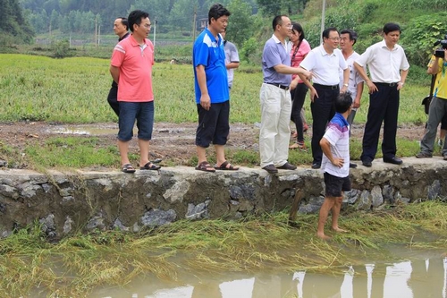 18日下午,邵阳市代市长龚文密、副市长李万千、副巡视员杜克平率市农业、民政、水利等部门负责人,深入该县滩头、荷田、荷香桥等乡镇察看受灾现场,指导农户开展生产自救。龚文密指出:当前县委县政府、各乡镇党委政府要组织群众积极开展生产自救,抓紧早稻抢收,抢插晚稻,做到早稻损失晚稻补,水田损失旱土补,市、县农业部门要加强灾后农业生产技术指导,要把灾情降低到最程度。县委书记钟义凡等隆回县党政领导陪同视察。
