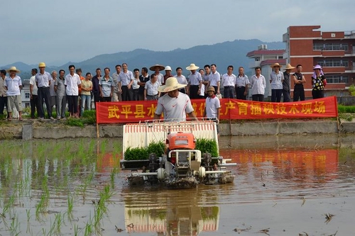 7月15日上午,福建省武平县农机管理站和心连心农机专业合作社在中山镇新城村跤场段省级水稻全程机械化示范基地联合举办晚稻机械育插秧现场演示会。演示会共组织了10台插秧机参演,县政府副县长,县农业局、县供销社、中山镇党委政府领导、县农机站干部职工、心连心农机专业合作社成员、农机大户、种粮大户以及农机补贴经销商技术人员、县电视台、报道组记者、观摩群众等300多人参加了现场会。