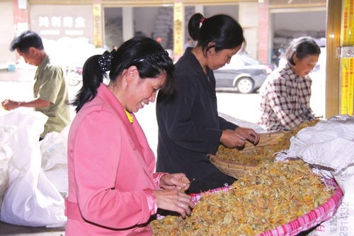 7月19日 ,隆回县小沙江镇农民在精选加工金银花。今年 ,该县小沙江 、麻塘山等高海拔乡镇药农种植的30万亩金银花喜获丰收 ,预计出产干金银花1.1万吨。