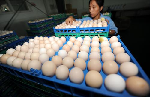 8月8日,丰城市铁骑力士集团的员工在对生产的富硒鸡蛋进行检查。