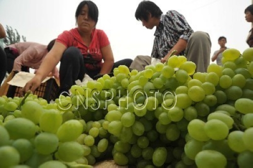 8月9日,山西运城市稷山县稷峰镇荆平村村民正在优质高效示范园葡萄基地采摘葡萄。当日,运城市稷山县稷峰镇荆平村优质高效示范园3000多亩维多利亚、红提、青提等无公害品种葡萄喜获丰收,果农忙着采摘装箱外销。近年,当地政府和相关部门依靠科技,加快推进“一村一品”、“一县一业”特色农业建设,全县已形成红枣、葡萄、苹果、鲜桃等上百个水果生产专业村,“一村一品”已成为农民致富增收的支柱品牌产业。