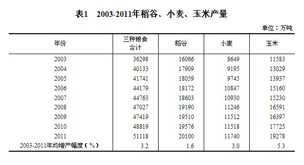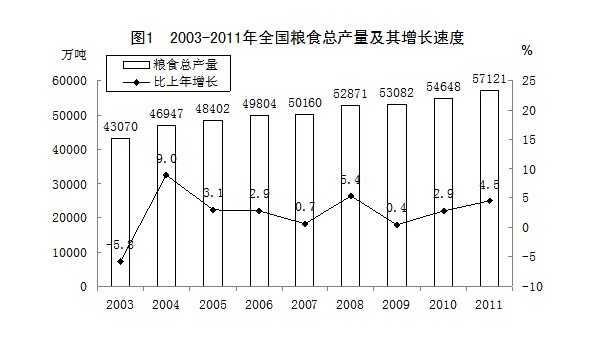 粮食综合生产能力连上新台阶。2011年,全国粮食总产量突破55000万吨大关,达到57121万吨,比2002年增产11415万吨,增长25%,年均增长2.5%。2004年至2011年粮食总产量实现连续八年增产,2007-2011年粮食总产量连续5年超5亿吨,标志着我国粮食综合生产能力稳定跃上新台阶。主要粮食作物产量稳步提高。其中,2011年,稻谷产量20100万吨,比2002年增长15.2%;小麦11740万吨,增长30%;玉米19278万吨,增长58.9%。