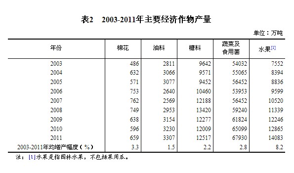 经济作物全面增产。2011年,棉花产量为659万吨,比2002年增产167万吨,增长34%,年均增产幅度为3.3%。油料产量为3307万吨,比2002年增产410万吨,增长14.1%,年均增产幅度为1.5%。糖料产量为12517万吨,增产2224万吨,增长21.6%,年均增产幅度为2.2%。蔬菜及食用菌产量达到67930万吨,增产15069万吨,增长28.5%,年均增产幅度为2.8%。水果产量为14083万吨,增产7131万吨,增长102.6%,年均增产幅度为8.2%。