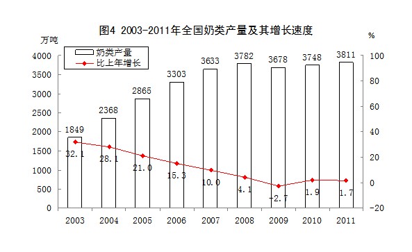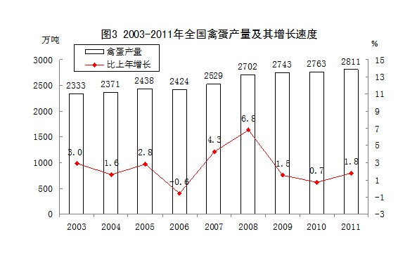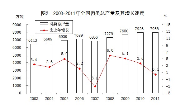 肉蛋奶等主要畜产品产量稳定持续增长。2011年全国肉类总产量达到7958万吨,比2002年增加1724万吨,增长27.6%,年均增长幅度为2.7%,肉类总产量稳居世界第一。其中,猪肉产量为5053万吨,增加930万吨,增长22.6%,年均增幅为2.3%;牛肉产量为648万吨,增加126万吨,增长24.2%,年均增长幅度为2.4%;羊肉产量为393万吨,增加110万吨,增长38.6%,年均增长幅度为3.7%;禽肉产量1709万吨,增加459万吨,增长36.7%,年均增长幅度为3.5%。2011年,全国禽蛋产量为2811万吨,比2002年增加545万吨,增长24.1%,年均增长幅度为2.4%。2011年,全国奶类产量为3811万吨,比2002年增加2411万吨,增长1.7倍,年均增长11.8%。其中牛奶3658万吨,增加2358万吨,增长1.8倍,年均增长12.2%。