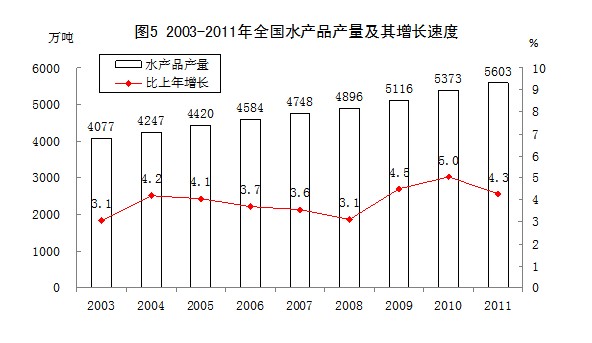 水产品产量快速增长。2011年,全国水产品总产量为5603万吨,比2002年增长41.7%,年均增长3.9%。其中,内陆水产品2695万吨,增长62.7%,年均增长5.6%;海水产品2908万吨,增长26.5%,年均增长2.6%。人工养殖扩张迅速。2011年,人工养殖水产品4023万吨,比2002年增长59.5%,年均增幅为5.3%。其中,人工养殖内陆水产品2472万吨,增长69.1%,年均增长6%;人工养殖海水产品1551万吨,增长46.3%,年均增长4.3%。海水捕捞增长较慢。2011年,捕捞水产品产量为1580万吨,比2002年增长10.3%,年均增长1.1%,分别比人工养殖低49.2和4.2个百分点。
