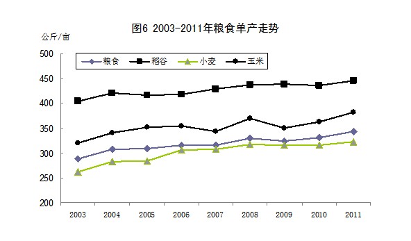 一是粮食单产屡创新高。2011年平均每亩粮食产量达到344公斤,比2002年提高了51公斤,增长17.4%。其中,稻谷亩产量为446公斤,提高33公斤,增长8.1%;小麦322公斤,提高71公斤,增长28.1%;玉米383公斤,提高55公斤,增长16.7%。