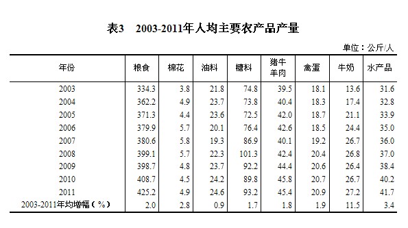 二是主要农产品人均产量逐步提高。2011年,全国人均粮食产量为425公斤,超过粮食安全标准25公斤,比2002年增长19.1%,年均增长2.0%;人均棉花、油料和糖料分别为4.9公斤、25公斤和93公斤,比2002年增长27.7%、8.8%和15.9%,年均分别增长2.8%、0.9%和1.7%;人均猪牛羊肉、禽蛋、牛奶和水产品分别为45公斤、21公斤、27公斤和42公斤,比2002年分别增长17.8%、18.2%、166.8%和35.0%,年均分别增长1.8%、1.9%、11.5%和3.4%。