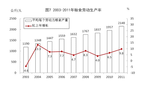三是粮食劳动生产率快速提高。2011年平均每个农业劳动力的粮食产量为2148公斤,比2002年增长72.2%,年均增幅为6.2%。