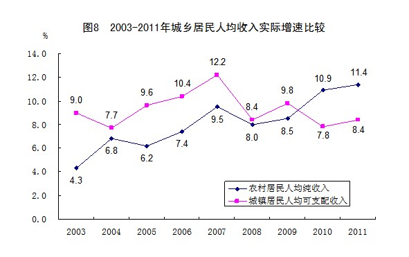 农民收入实现连续多年较快增长。十六大以来,党中央、国务院坚持把增加农民收入做为农村工作的中心任务,千方百计拓宽增收渠道,农民人均纯收入增长迅速。2011年,农民人均纯收入6977元,比2002年增长1.8倍,年均实际增长8.1%,其中2010、2011年连续2年收入增速超过城镇。