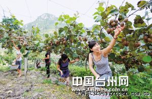 在临海市小芝镇岩峰山猕猴桃专业合作社,几名游客正忙着采摘高山猕猴桃。利用岩峰山海拔400多米的高山优势,当地村民林卫平投资600多万元,创办了台州最大的高山猕猴桃基地。