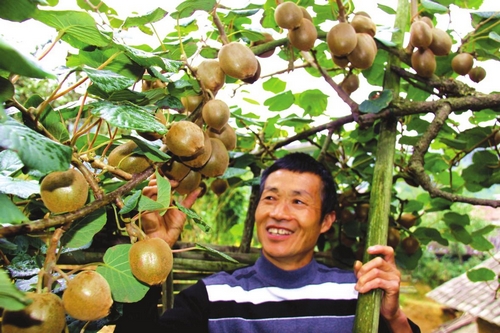 9月16日,隆回县小沙江镇龙坪村农民阳征凡望着猕猴桃压弯了枝头喜上眉梢。今年,该镇实行无公害标准化猕猴桃生产,5000多亩猕猴桃喜获丰收。