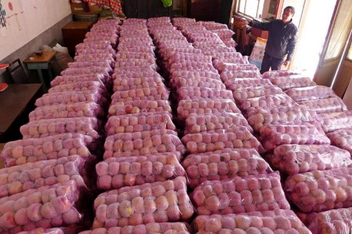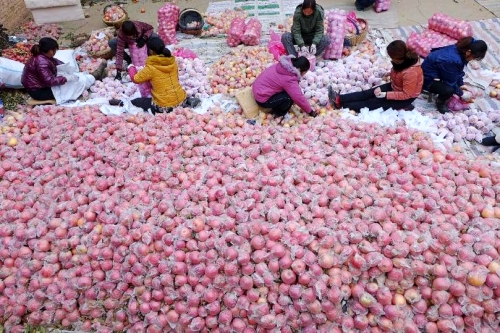 11月24日,在山西省运城市万荣县南张乡百帝村,果农将采收的苹果分装,准备入库储存。