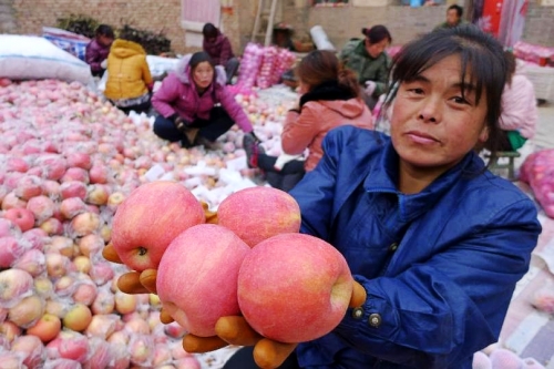 11月24日,在山西省运城市万荣县南张乡百帝村,果农展示即将入库储存的苹果。