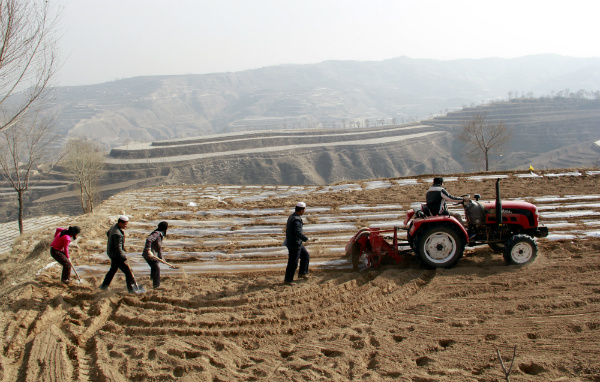 甘肃省永靖县川城镇群众抓紧覆膜保墒
