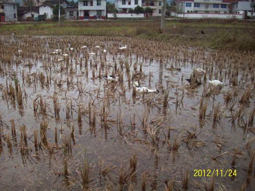 清流县嵩溪镇是商品粮食生产大镇,全镇有秋季晚稻田18358 亩,秋季晚稻收割完成后大部分稻田处于闲置状态。近年来,在镇政府的支持和畜牧兽医技术人员的指导下,该镇冬闲稻田养鸭快速发展,2012年全镇12个村都开展了冬闲稻田养鸭,特别是嵩溪、塘背、罗陂岗、元山、青溪、黄沙口、伍家坊等七个村75%农户年年都坚持冬闲稻田养鸭,冬闲田成为他们增收的宝贝。