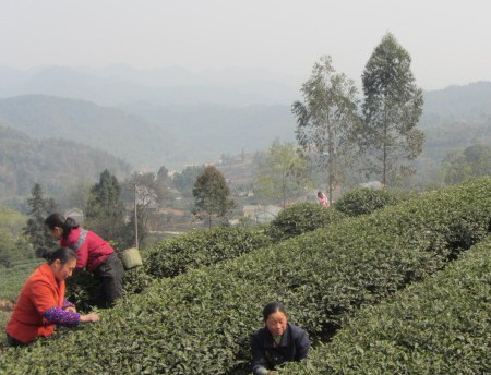 随村支书黄明宪来到该村银杏茶园,满山茶叶一埂又一埂,黄蓝板诱杀、太阳能杀虫灯等现代农业设备把绿油油的茶山装点得更加美丽。“以前这片地种苞谷、水稻、红薯,一年下来也只有一千多块钱。现在改种茶,一亩茶收入四五千元。”说起今昔变化,正在采茶的村民彭明燕望着满园的茶叶笑了。原来,几年前,村上仍是传统农业,户均年收入两三千元。村干部动员大家发展茶叶,但大伙儿怕改种茶树后没粮食吃。“在这节骨眼上,碰上国家实行退耕还林政策,每亩茶给200多元的补助,县上还给种苗、技术支持,让我们吃了‘定心丸’。”彭明燕说。