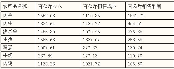 在10个养殖业品种中,淡水鱼亩均销售利润实现6602.22元,位居10个养殖品种的首位;其次是奶牛,每头奶牛的牛奶销售利润实现4531.06元;观赏犬和肉牛的每只(头)销售利润分别为2409.10元和2136.08元;观赏鱼、肉羊、蜂蜜和生猪的单位产品销售利润分别为507.46元、488.11元、292.57元和256.51元;蛋鸡和肉鸡的每只销售利润为20.20元和2.60元。从每百公斤单位产品实现的销售利润情况看,在7个主要养殖品种中,每百公斤产品销售利润最高的是肉羊,为1541.72元,排在最后的是肉鸡,每百公斤销售利润为106.56元。