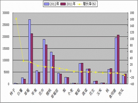 2012年,17个种植品种的综合亩均利润为7925.20元,同比减少156.66元,下降1.9%,综合亩均生产(销售)利润率为39.2%,同比下降0.8个百分点。其中:亩均生产(销售)利润同比增加的有8种,占47.1%;亩均生产(销售)利润同比减少的有9种、占52.9%。