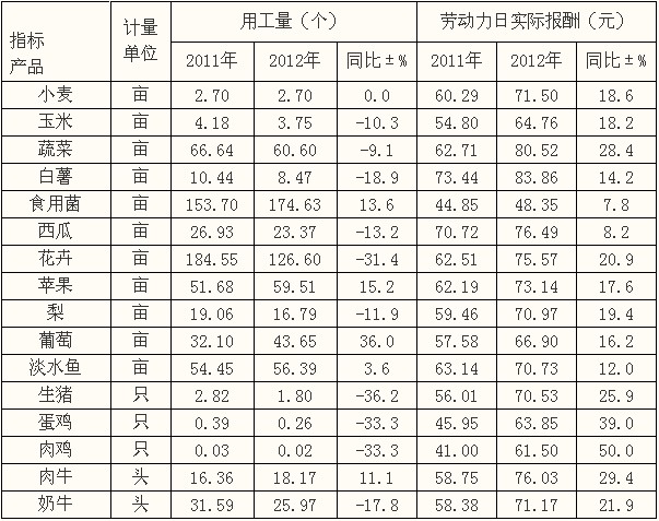 2011―2012年主要农产品活劳动投入产出效益对比表
