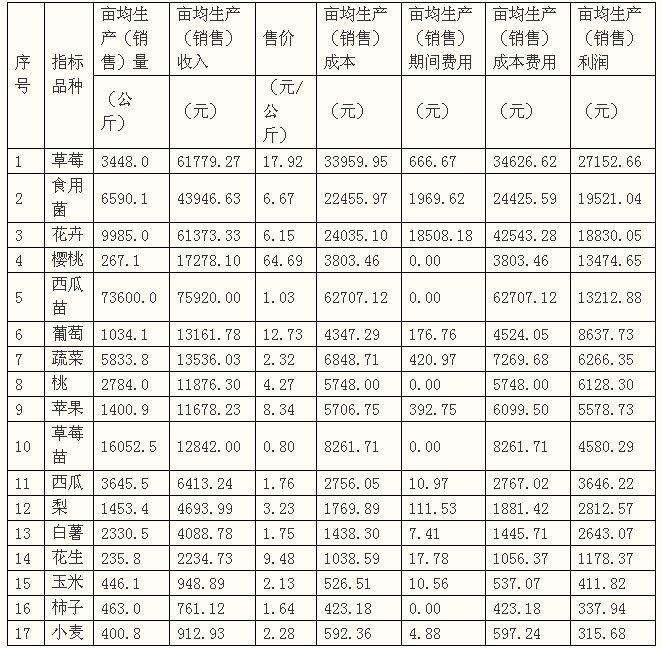 17个以土地为主要生产资料的农产品中,亩均生产(销售)利润在万元以上的有5个,占29.4%,其中最高的是草莓,达到27152.66元,位居第二的是食用菌,接近2万元;亩均生产(销售)利润在万元以下千元以上的有9个,占53%;亩生产(销售)利润不足500元的有3个,占17.6%,分别是玉米、柿子和小麦,其中小麦的生产效益最低,亩均生产利润315.68元。