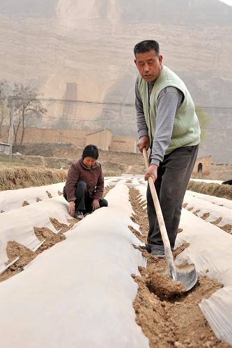 3月13日,在甘肃省甘谷县大象山镇狄庄村,村民狄改鲁(右)和老伴一起给自家田地覆膜保墒。据甘肃省农牧厅数据,今年入春以来,甘肃各地降水量较往年偏少,气温回升迅速,使农业受旱面积达856万亩,其中农作物受旱308万亩,春耕生产面临严峻挑战。甘肃省计划在3月底前推广500万亩顶凌覆膜,以提高旱作农业集约化程度。新华社记者 陈斌 摄