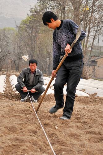 3月13日,在甘肃省甘谷县大象山镇狄庄村,农民在土地上划线备耕。新华社记者 陈斌 摄