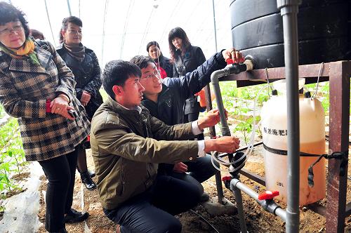 3月21日,在天津大邱庄镇的津美设施农业园区,新疆农业技术员在观看园区工作人员操作温室大棚里的重力滴灌系统。