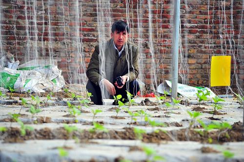 3月21日,在天津大邱庄镇的津美设施农业园区,来自和田地区策勒县的农业技术员艾尼?艾克木在观看大棚茄子苗的生长情况。新华社发(游思行 摄)