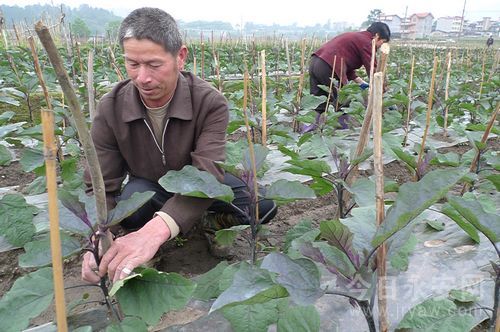 4月13日,永安市燕东街道麻岭村菜农乐荣华夫妇俩正在菜地里为茄子疏叶,再过半个月,他种植的无公害茄子即可上市。他种植有3亩多的无公害蔬菜,每年有7至8万元的收入。
