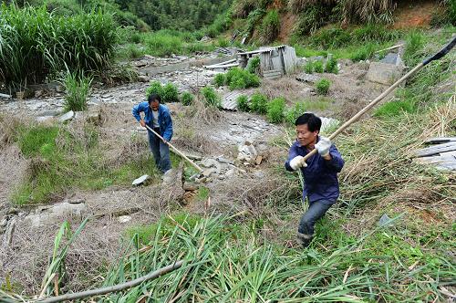 4月23日,福州市闽侯县大湖乡六锦村村民对禁养区内猪栏拆除后的土地进行复垦。
