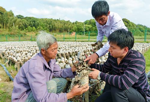 4月23日,福州市晋安区日溪乡梓山村原养猪户方建灼(左一)在观察木耳的生长情况。