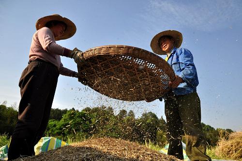 4月26日,农民在江西省婺源县太白镇河岸村筛选油菜籽。