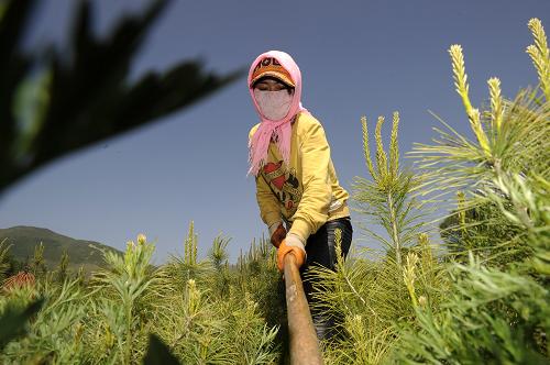 在宁夏泾源县兴盛镇,当地村民在为苗木锄草(5月20日摄)。