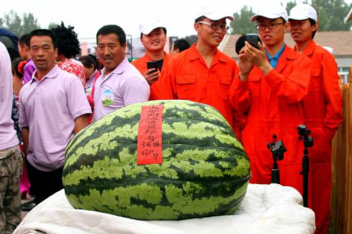 5月28日,在北京大兴西瓜节上,游客在观看重47.6公斤的大西瓜。