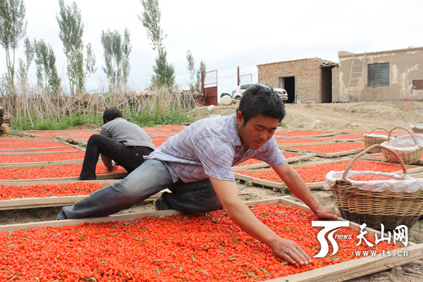 6月18日,新疆精河县托里乡克孜勒加尔村村民苏培新夫妇正在晾晒枸杞。
