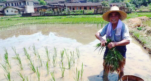 图为7月29日永安市曹远镇吴家坊村农民吴成炳正在自家的农田里插晚稻