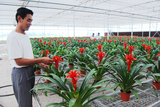 为进一步发挥蔬菜花卉育苗功能区作用,玉门顺兴现代农业产业示范园投资720万元建成了温室集中育苗中心。该育苗中心年育苗能力达到2000万株,可满足玉门镇及周围8个乡镇的6500座日光温室、1万座拱棚种植的需要。图为育苗中心技术人员观察花卉长势。