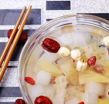 因此饮食养肺应多吃乌骨鸡、猪肺、燕窝、银耳、蜂蜜、芝麻、豆浆、藕、核桃、薏苡仁、花生、鸭蛋、梨等,但要结合个人体质、肠胃功能酌量选用。白木耳有补肺润燥之功能,胡桃有补肾安神之效,秋季服用更有疗效。梨肉香甜可口,肥嫩多汁,有清热解毒,润肺生津、止咳化痰等功效,生食、榨汁、炖煮或熬膏,对肺热咳嗽、麻疹及老年咳嗽、支气管炎等症有较好的治疗效果。若与荸荠、蜂蜜、甘蔗等榨汁同服,效果更佳。这些食物与其他有益食物或中药搭配则功效更佳。
