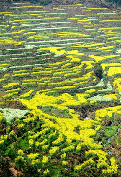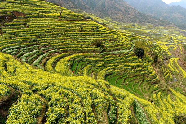 近日,江西省婺源县江湾镇篁岭古村周围梯田里的油菜花竞相怒放,吸引了众多游客和摄影爱好者。据悉,每年三、四月间,江西省婺源县山间油菜花盛开,层层叠叠的梯田形成一幅美丽的画卷。婺源的油菜花海每年都会吸引上百万游客。