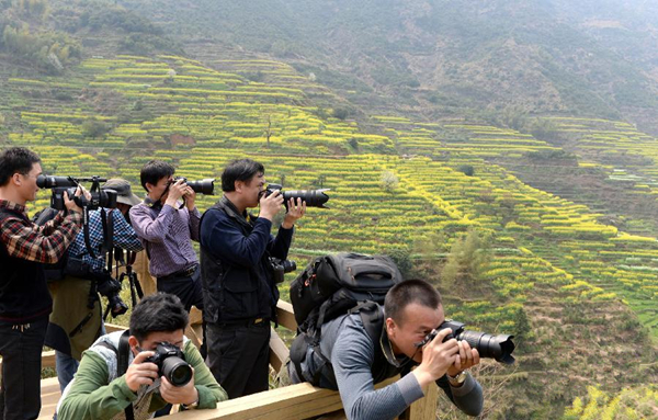 3月25日,游客在篁岭梯田拍摄油菜花。新华社记者 宋振平 摄