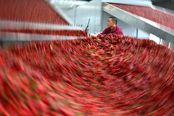 9月18日,湖北省宣恩县鹏博生态农业公司的员工在按照客户要求加工红辣椒。