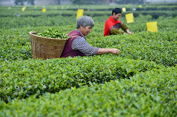 9月17日,湖北省宣恩县水田坝村农民在手工采摘茶叶。为适应网络销售形势,当地农民摒弃以前机械采茶的习惯而改用手工精细化采摘。