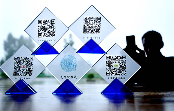 9月18日,在湖北省宣恩县黄坪村黄金梨合作社,顾客使用“扫一扫”功能关注黄金梨产品。