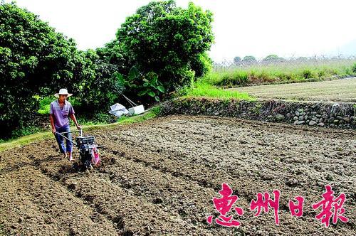 农民用松土机翻整田地。地里的花生收了,为了不让田地闲着,大亚湾区西区街道塘布村的农民日前对田地进行翻整,准备进行冬种。