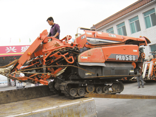 当日上午9点,农机大户们陆续将自家的水稻联合收割机开到耕沃农机服务专业合作社门前进行装车。崔铁岩是海城温香前双村的农机大户,家有两台拖拉机、两台水稻收割机和三台水稻插秧机,他是耕沃农机服务专业合作社的负责人,也是此次跨区作业队伍的组织者。据崔铁岩介绍,从2006年开始,他们合作社以集体的名义外出作业,良好的信誉和服务质量赢得了信赖,黑龙江地区的部分农场与他们达成了合作关系。3年来,每到秋收时节,他们都到那里进行20天的跨区作业,每台机器的纯收入能够达到3—4万元,回来后恰好赶上本地区水稻收割。一个半月的秋收中,一台水稻收割机纯收入7万余元。