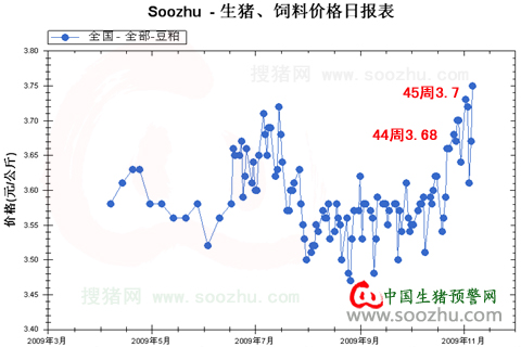 2、 豆粕价格:连续5周上涨 至3.7元/公斤