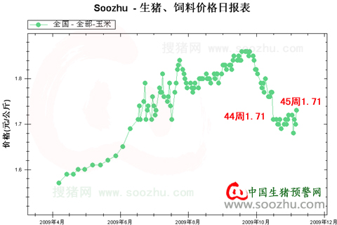 参考此图,据“soozhu-中国生猪市场预警系统”信息显示,本周全国玉米平均价格为1.71元/公斤,较上周持平。玉米的减产支持后市价格的回升。